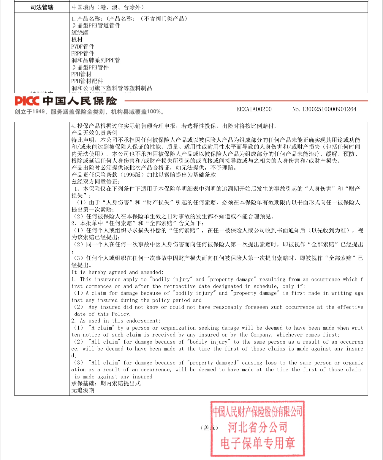 江苏润和β晶型PPH管阀件由中国人民保险承保,企业官方披露的保险合同或认证文件为准。